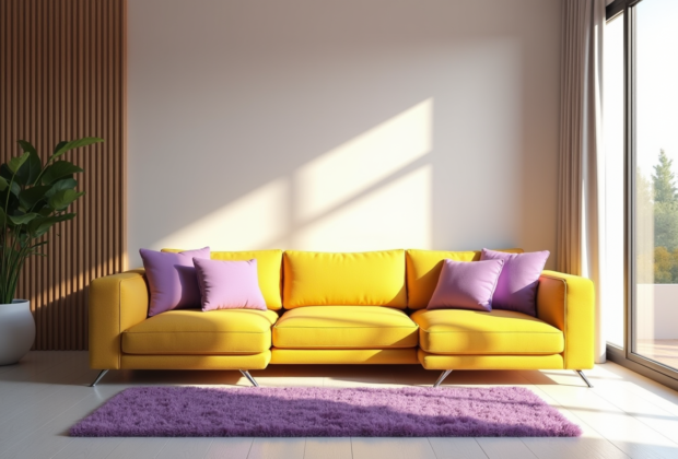 - Le mobilier : choisissez un canapé violet et des coussins jaunes pour une touche moderne.