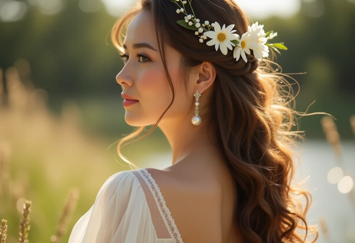Les cheveux détachés ondulés évoquent une élégance naturelle, presque insouciante. Pour accentuer cette allure, rien de tel qu’une couronne de fleurs, idéale pour celles qui rêvent d’un mariage bohème chic. On peut aussi ponctuer ces ondulations d’épingles discrètes, qui accrochent la lumière et attirent le regard sur chaque mouvement.