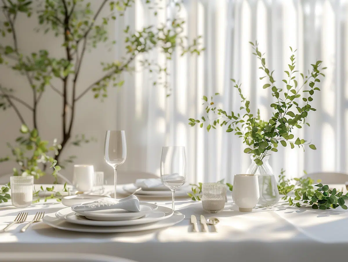Les fleurs et la verdure sont incontournables pour créer une ambiance raffinée. Optez pour des compositions florales simples, comme un bouquet de gypsophile ou des branches d’eucalyptus disposées le long de la table. Ces éléments naturels ajoutent de la fraîcheur et de la légèreté à la décoration.