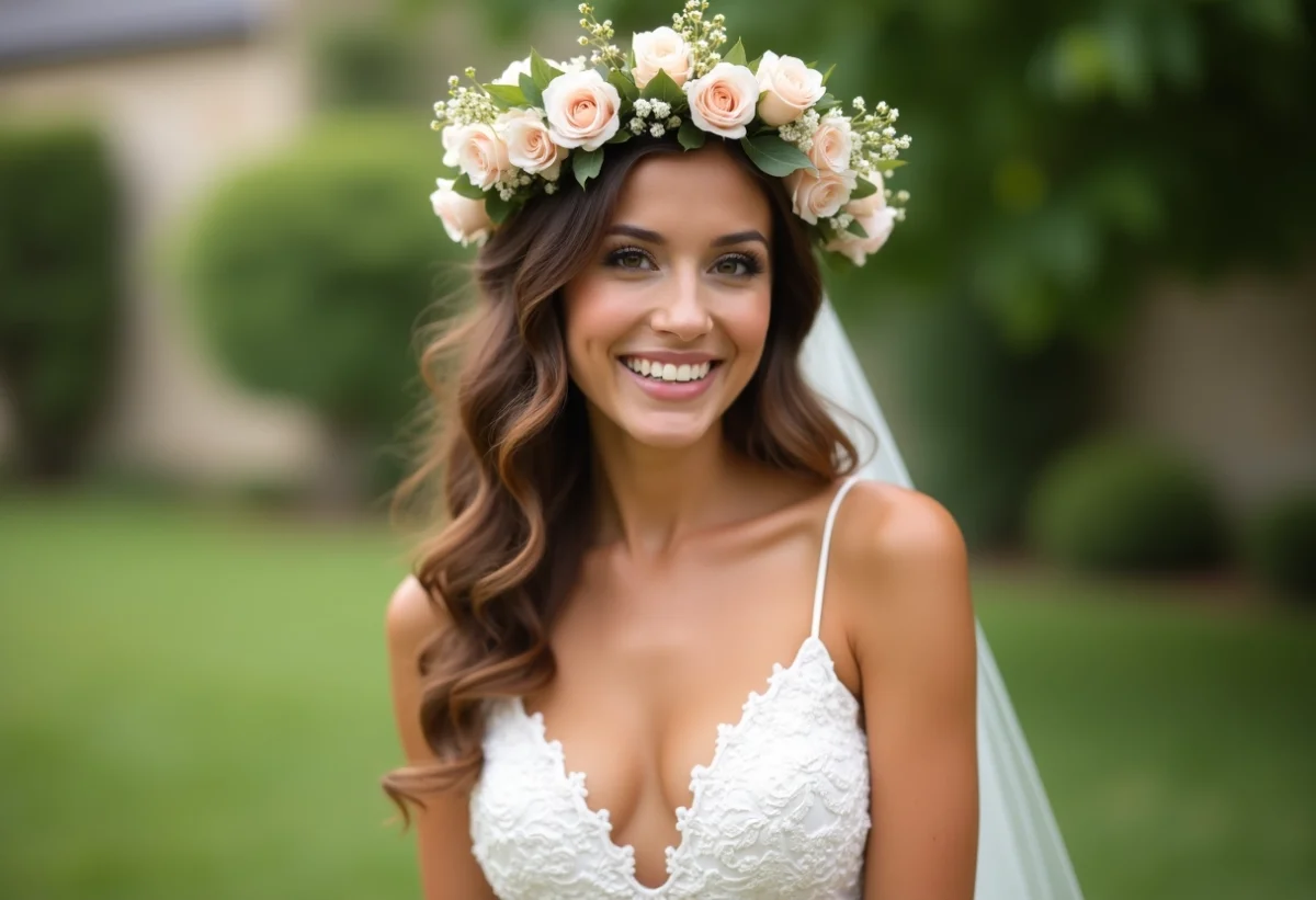 - Couronnes de fleurs : idéales pour un look bohème et naturel. Elles se marient parfaitement avec des ondulations romantiques ou un chignon désordonné.